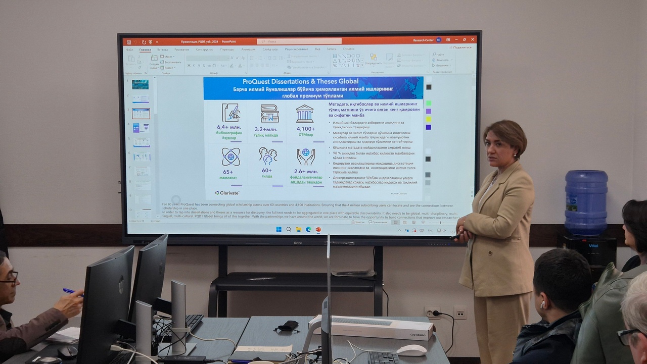 С 10 по 17 ноября 2025 года в Центре исследования проблем приватизации и управления государственными активами проведён тренинг по курсу «Современные методы поиска, анализа и оценки научных данных», проведённая представителями компании ООО “E-LINE PRESS” — официального партнёра международных научных издательств и агрегаторов. Презентацию провели Шодманова Феруза и Пазилова Наргиза.