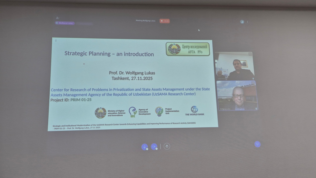 27 ноября 2025 года для руководства и заведующих отделами Центра был организован тренинг на тему «Основы стратегического планирования» в рамках проекта «Strategic and Institutional Modernization of the UzSAMA Research Center towards Enhancing Capabilities and Improving Performance of Research Activity (SAMARA)», финансируемого за счет гранта проекта MUNIS Всемирного Банка. Тренинг провел онлайн, международный консультант проекта Wolfgang Lukas, который рассказал о различиях между бизнес-стратегией и институциональной стратегией, инструментах SWOT- и PESTEL-анализа, основных этапах стратегического планирования и элементах успешной стратегии.