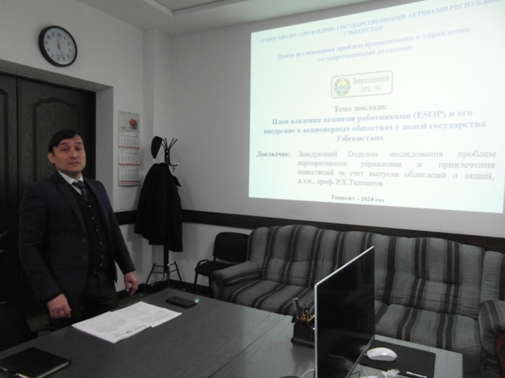 30 октября 2024 года Центром был организован и проведен очередной научный семинар, на котором выступили с докладом заведующий отделом Р.Ташматов на тему «План владения акциями работниками (ESOP) и его внедрение в акционерных обществах с долей государства Узбекистана» по результатам исследований на II квартал 2024 года, и старший научный сотрудник В.Галкин на тему «Факторы, сдерживающие эффективность деятельности судебных управляющих в Узбекистане».