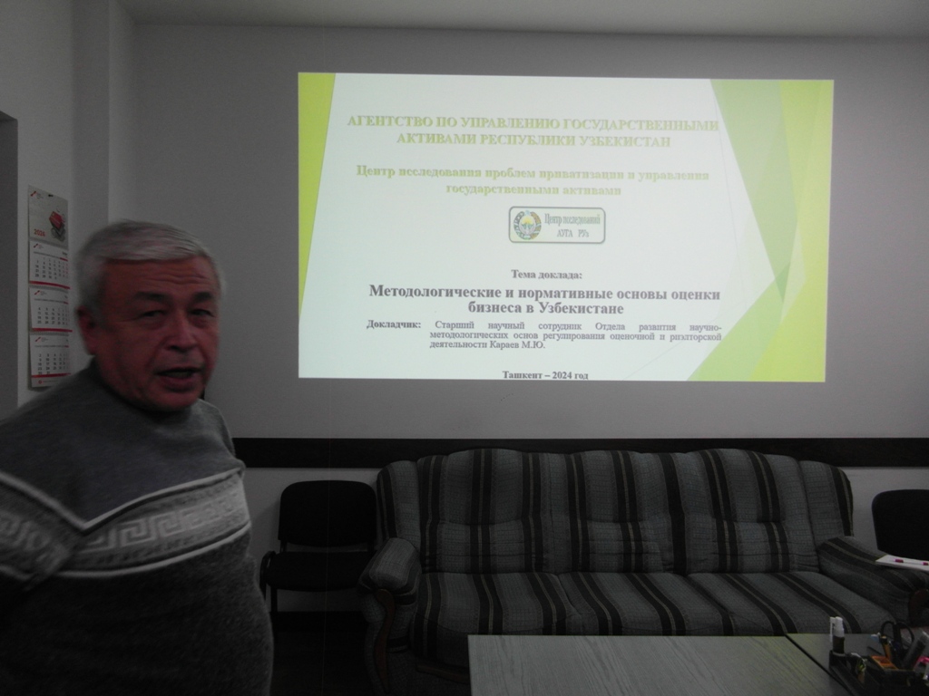15 ноября 2024 года Центром был организован и проведен очередной научный семинар в рамках Научной лаборатории анализа и моделирования развития имущественных и рыночных отношений, на котором выступили с докладом старший научный сотрудник Т.Кадыров на тему «Результаты анализа влияния процессов приватизации на повышение официальной занятости» по результатам исследований на III квартал 2024 года, и старший научный сотрудник М.Караев на тему «Методологические и нормативные основы оценки бизнеса в Узбекистане» по результатам исследования на III квартал 2024 года.