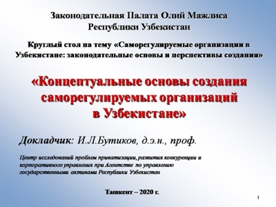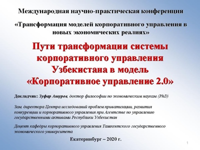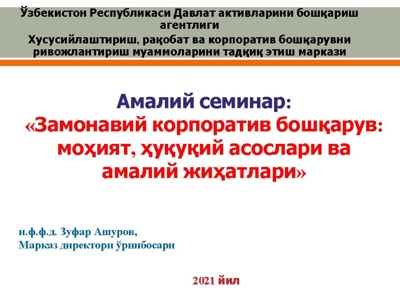 Одним из главных государственных институтов, обеспечивающих непосредственную реализацию этих процессов, является Агентство по управлению государственными активами Республики Узбекистан, осуществляющий конкретные мероприятия по экономическому реформированию страны. Агентство не только на практике осуществляет приватизацию, управляет государственным имуществом, формирует рынки ценных бумаг и недвижимости, внедряет корпоративное управление, но и разрабатывает концептуальные, методические положения и нормативно-правовые документы, связанные с вышеуказанными процессами. В этом посильную помощь ему оказывает входящий в его структуру Центр исследования проблем приватизации и управления государственными активами.