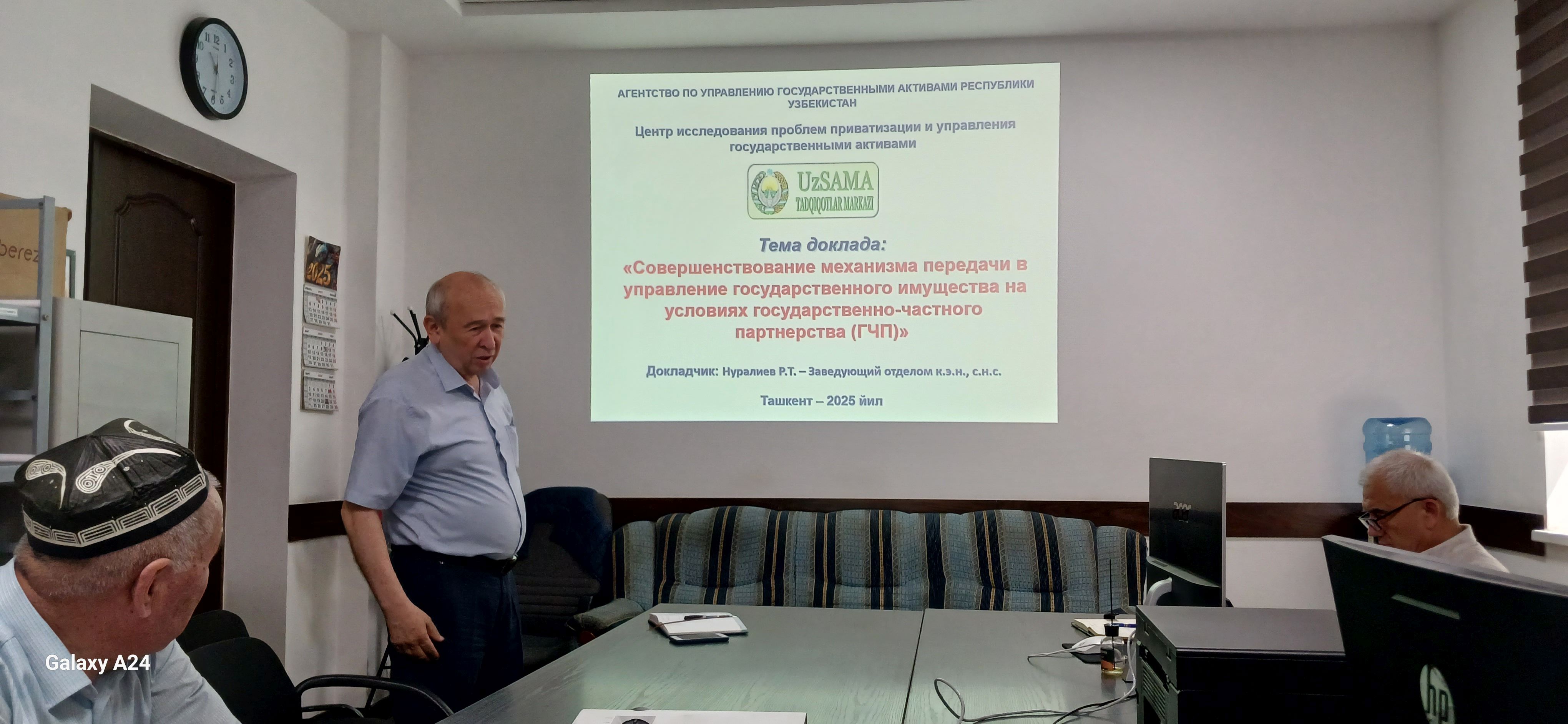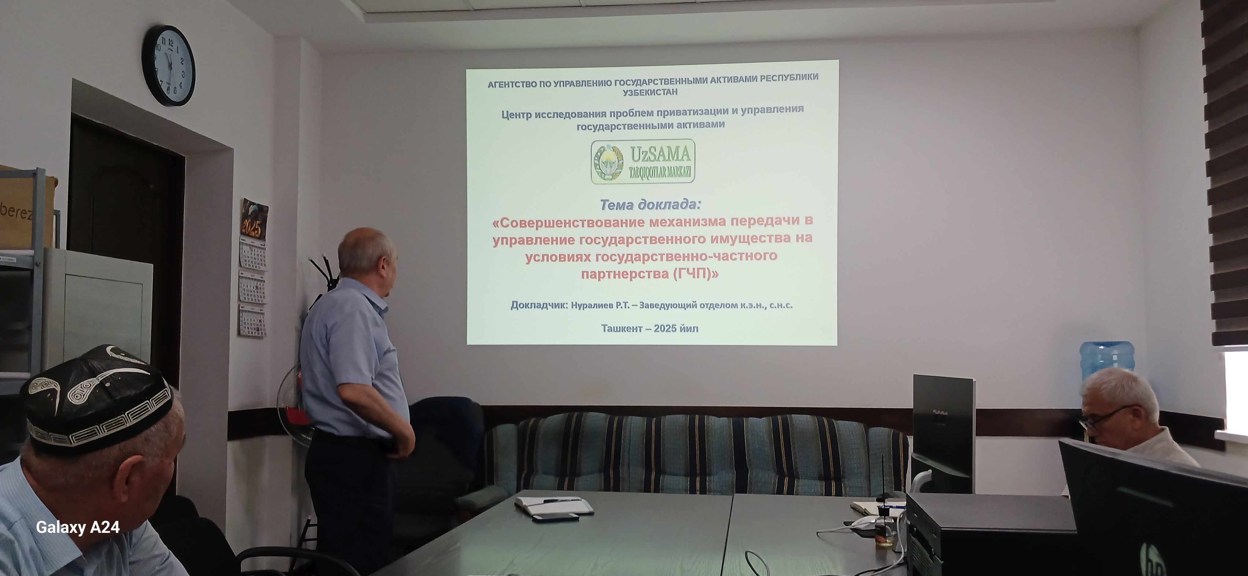 30 мая 2025 года Центром был организован и проведен очередной научный семинар в рамках Научной лаборатории анализа и моделирования развития имущественных и рыночных отношений, на котором выступили с докладом заведующий отделом А.Валижонов на тему «Анализ состояния приватизации жилья хокимиятами районов (городов) и предложения по совершенствованию процесса приватизации государственного жилищного фонда» по результатам исследования на II квартал 2025 года, и заведующий отделом Р.Нуралиев на тему «Совершенствование механизма передачи в управление государственного имущества на условиях государственно-частного партнерства (ГЧП)» по результатам исследования на II квартал 2025 года.