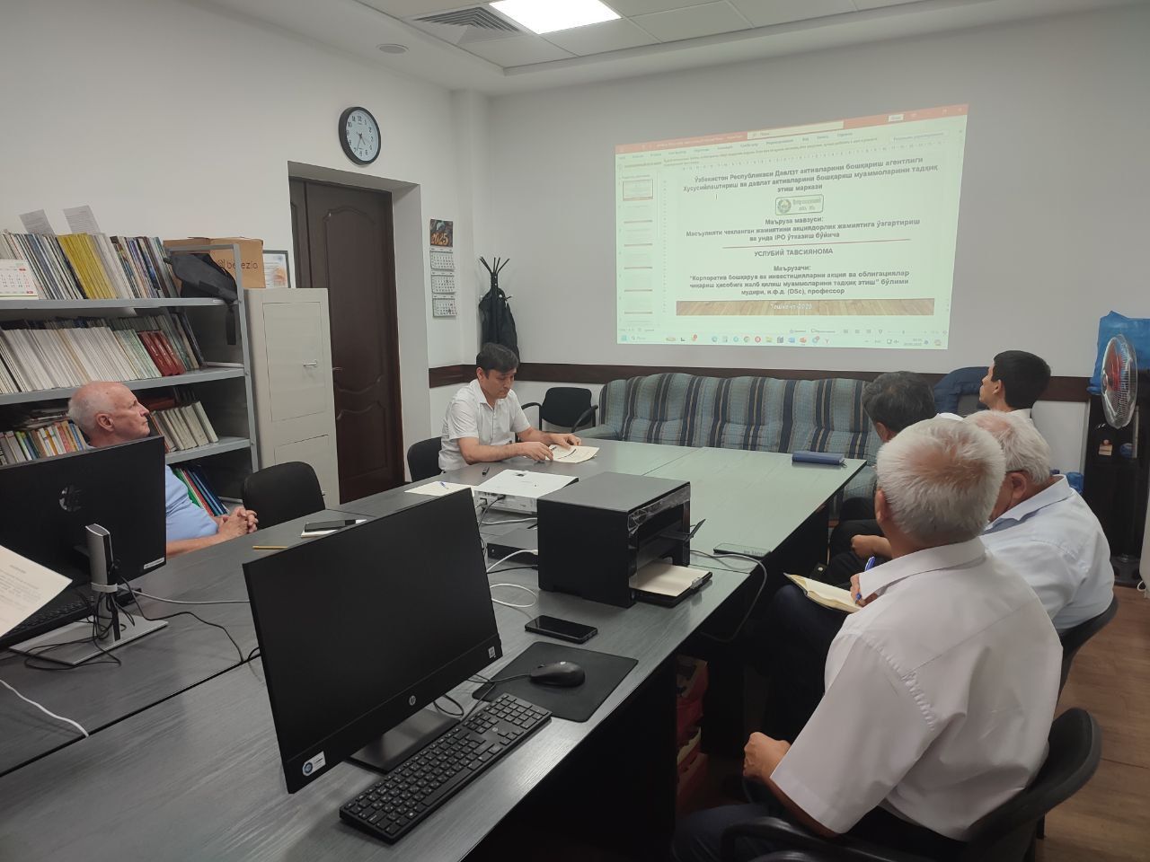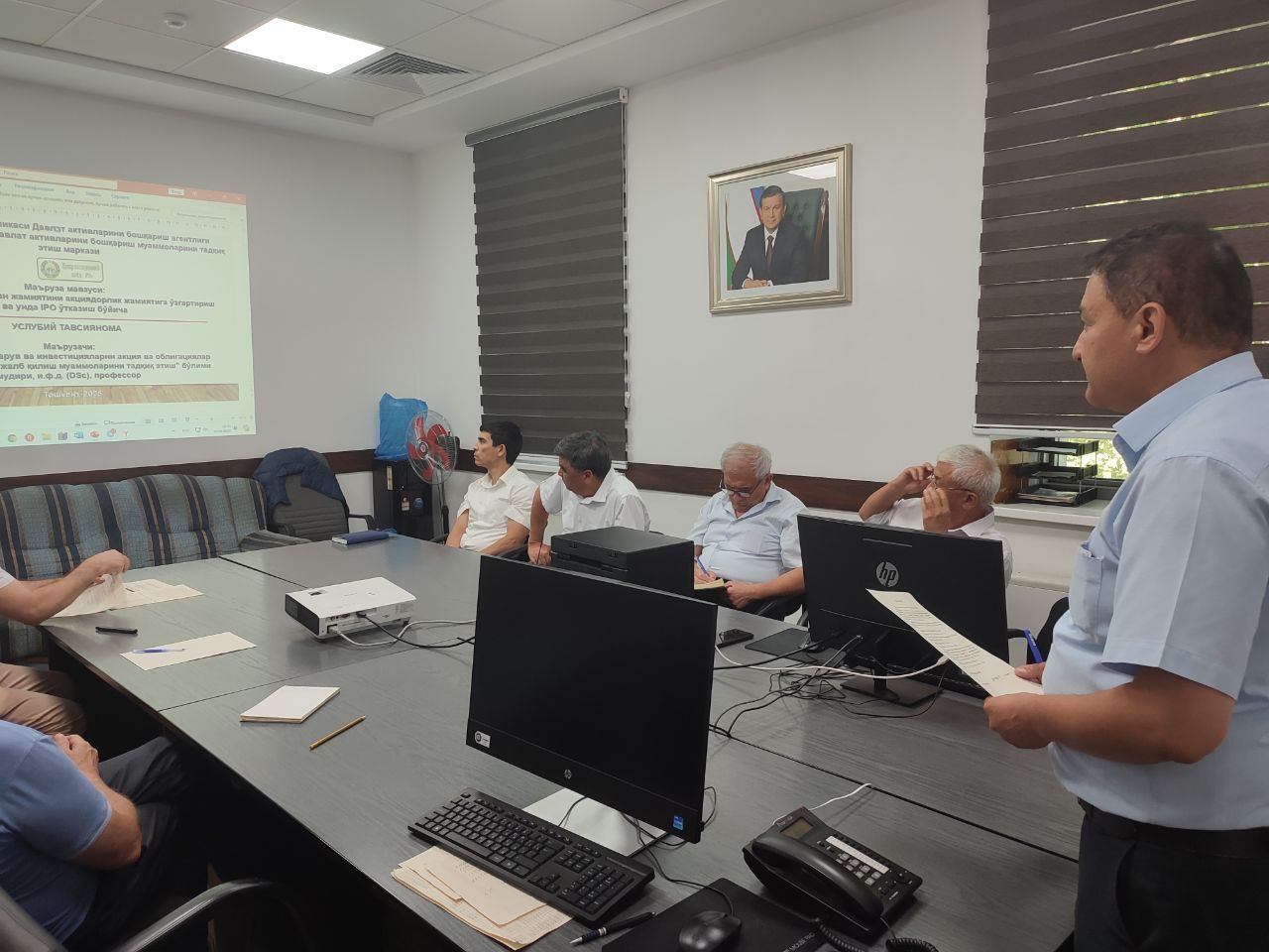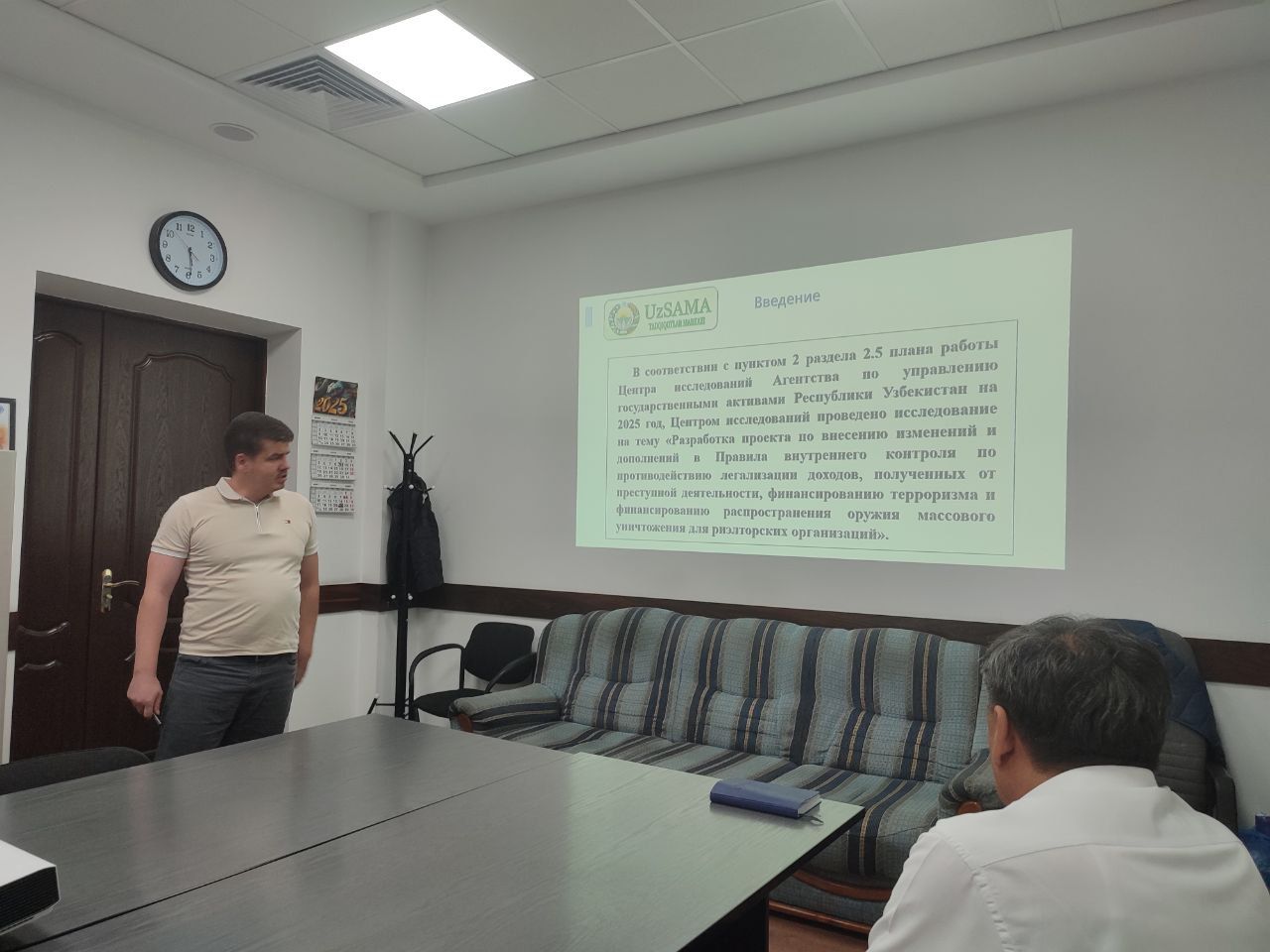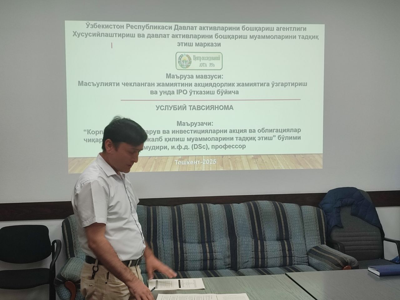 30 июня 2025 года Центром был организован и проведен очередной научный семинар в рамках Научной лаборатории анализа и моделирования развития имущественных и рыночных отношений, на котором выступили с докладом заведующий отделом Р.Ташматов на тему «Методические рекомендации по преобразованию ООО в АО с поледуюўим проведением IPO» по результатам исследования на I квартал 2025 года, старший научный сотрудник М.Караев на тему «Основные положения Кодекса этики оценщика» по результатам исследования на I квартал 2025 года, и стажер-исследователь Ф.Мирзарахманов на тему «Пути совершенствования Правил внутреннего контроля по противодействию легализации доходов, полученных от преступной деятельности, финансированию терроризма и финансированию распространения оружия массового уничтожения для риэлторских организаций» по результатам исследования на II квартал 2025 года.