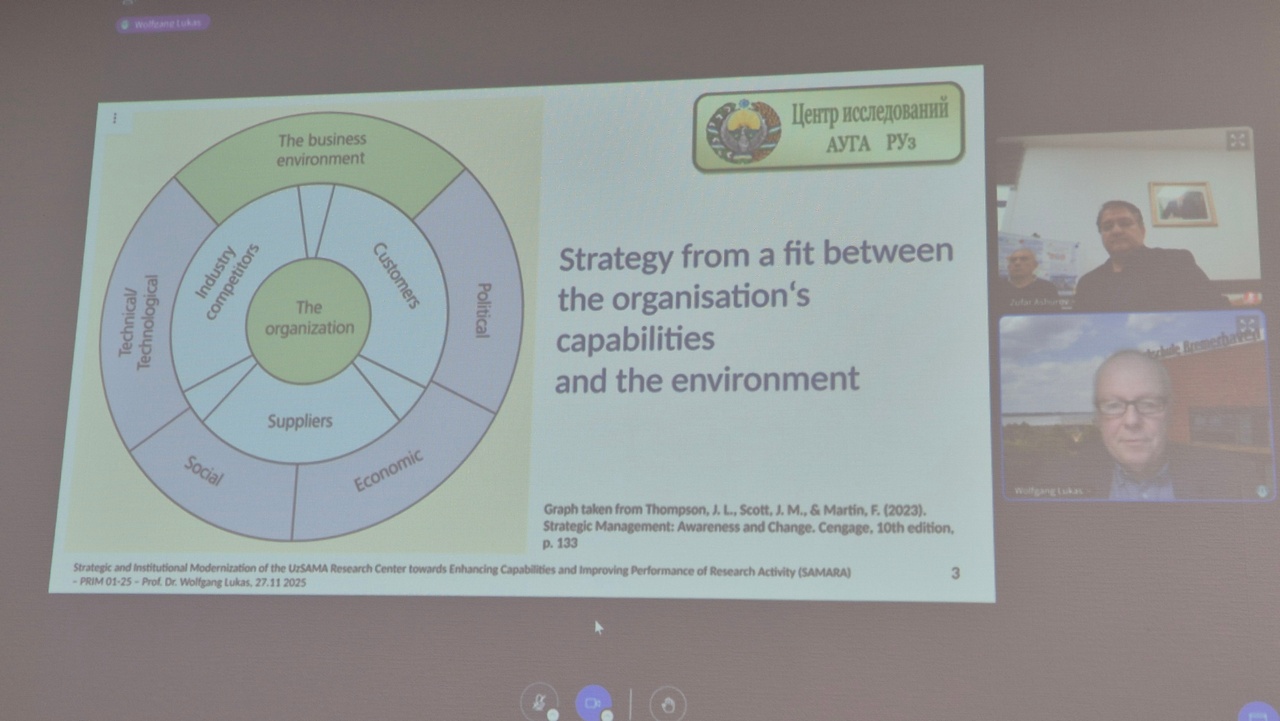 27 ноября 2025 года для руководства и заведующих отделами Центра был организован тренинг на тему «Основы стратегического планирования» в рамках проекта «Strategic and Institutional Modernization of the UzSAMA Research Center towards Enhancing Capabilities and Improving Performance of Research Activity (SAMARA)», финансируемого за счет гранта проекта MUNIS Всемирного Банка. Тренинг провел онлайн, международный консультант проекта Wolfgang Lukas, который рассказал о различиях между бизнес-стратегией и институциональной стратегией, инструментах SWOT- и PESTEL-анализа, основных этапах стратегического планирования и элементах успешной стратегии.