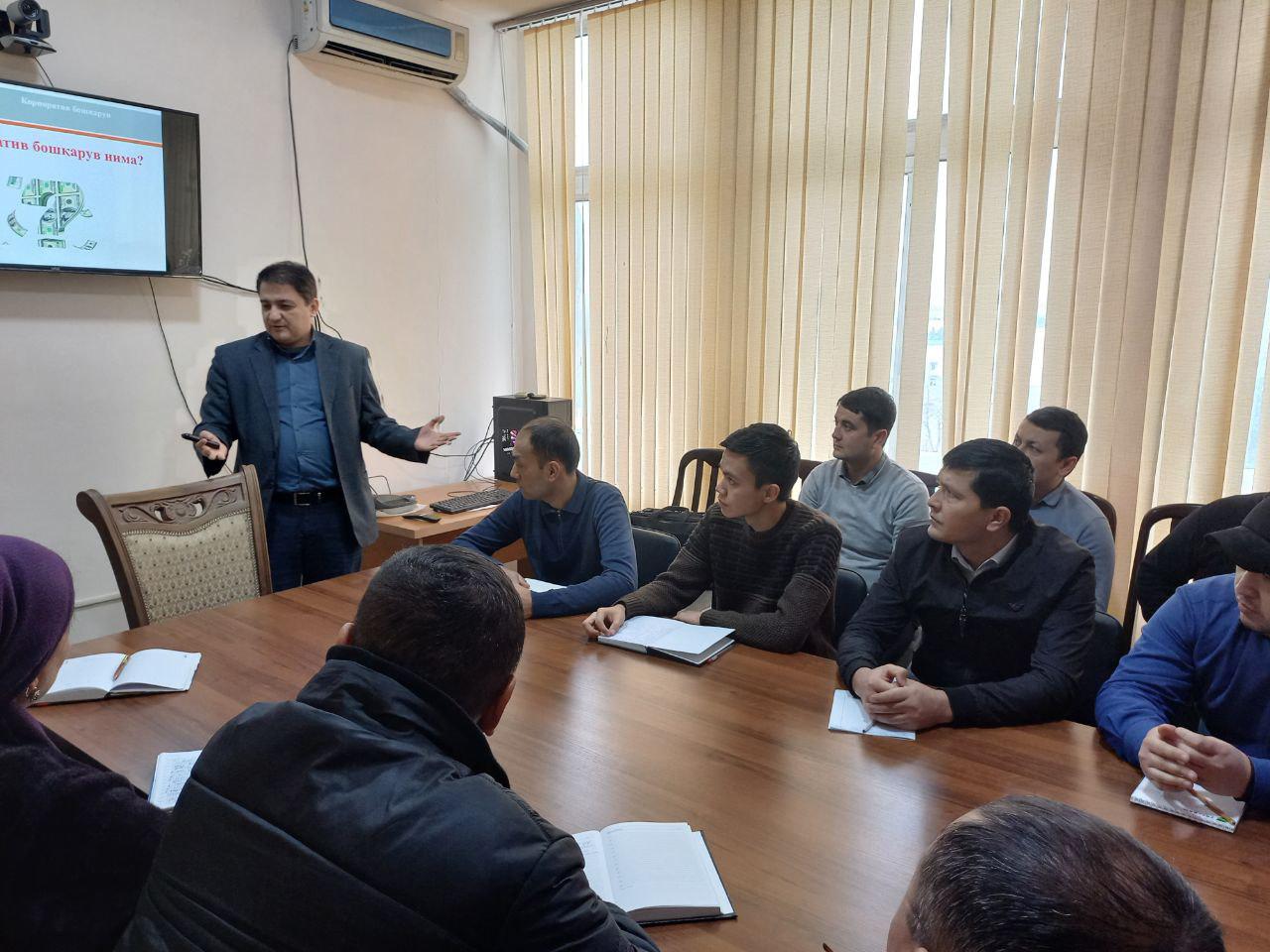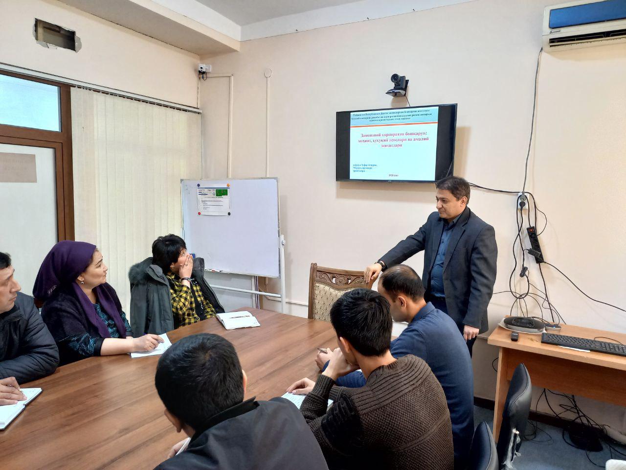 7 февраля 2022 года заместителем директора Центра исследований З.А.Ашуровым проведен практический семинар на тему «Современное корпоративное управление: сущность, правовые основы и практические аспекты» для работников Андижанского областного территориального управления Агентства по управлению государственными активами Республики Узбекистан. В ходе данного мероприятия он рассказал участникам о сущности и значении корпоративного управления в современном мире, цели и задачах эффективного корпоративного управления согласно международным стандартам, правовых основах корпоративного управления в Узбекистане, а также о практических аспектах корпоративных отношений между акционерами, наблюдательным советом и исполнительным органом АО. В конце мероприятия участники задавали вопросы, обменивались мнениями и обсуждали проблемы, связанные с практической деятельностью членов наблюдательных советов, ревизионных комиссий в хозяйствующих обществах с государственным участием.