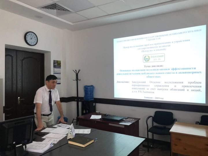 15 июня 2023 года Центром был организован и проведен очередной научный семинар, в котором выступил с докладом заведующий отделом Р.Ташматов на тему «Основные положения методики оценки эффективности деятельности членов наблюдательного совета акционерного общества» по результатам исследования на I квартал 2023 г.