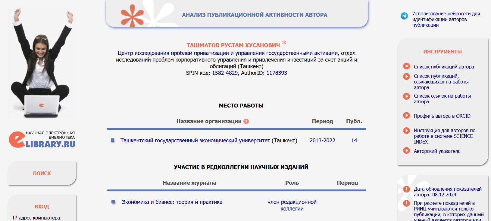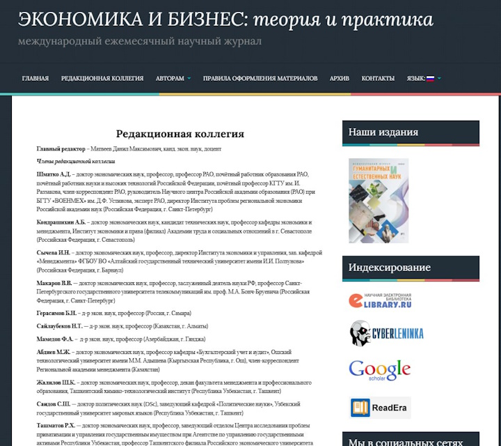 Заведующий отделом исследования проблем корпоративного управления и привлечения инвестиций за счет ввыпуска акций и облигаций Центра исследований Агентства по управлению государстсвенными активами д.э.н., проф. Ташматов Р.Х. включен в состав редакционной коллегии международного ежемесячного научного журнала «ЭКОНОМИКА И БИЗНЕС: теория и практика». Журнал зарегистрирован в Федеральной службе по надзору в сфере массовых коммуникаций, связи и охраны культурного наследия (Российская Федерация), номер свидетельства ПИ №ФС 77-80221 от 19.01.2021 и включен в систему Российского индекса научного цитирования (РИНЦ) на платформе Elibrary.ru, номер договора — 34-02/2015 от 04.02.2015 г. http://economyandbusiness.ru, https://www.elibrary.ru/title_about_new.asp?id=53633