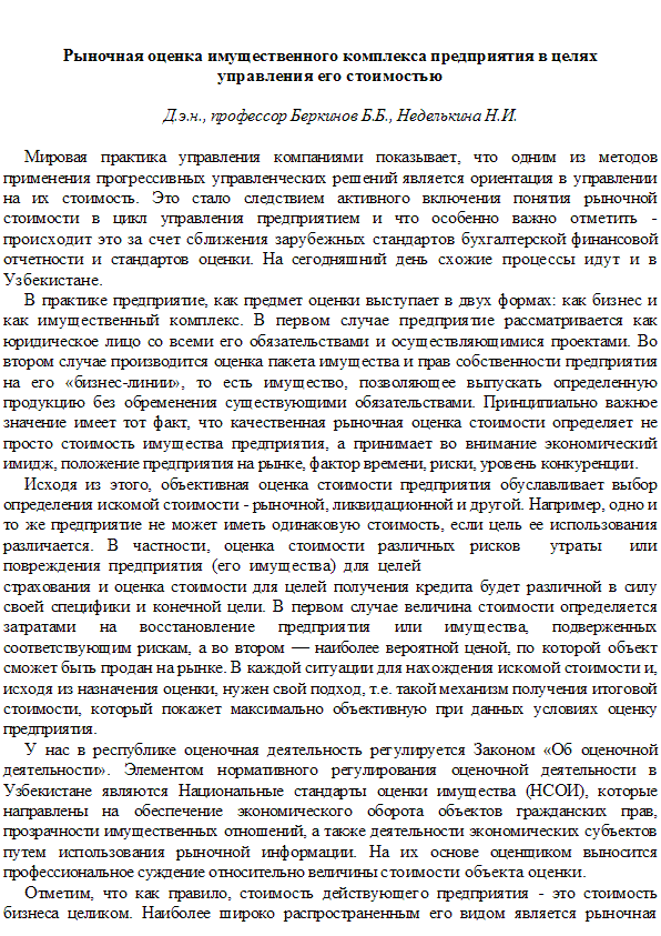 Беркинов Б.Б., Неделькина Н.И. : «Рыночная оценка имущественного комплекса предприятия в целях управления его стоимостью |
