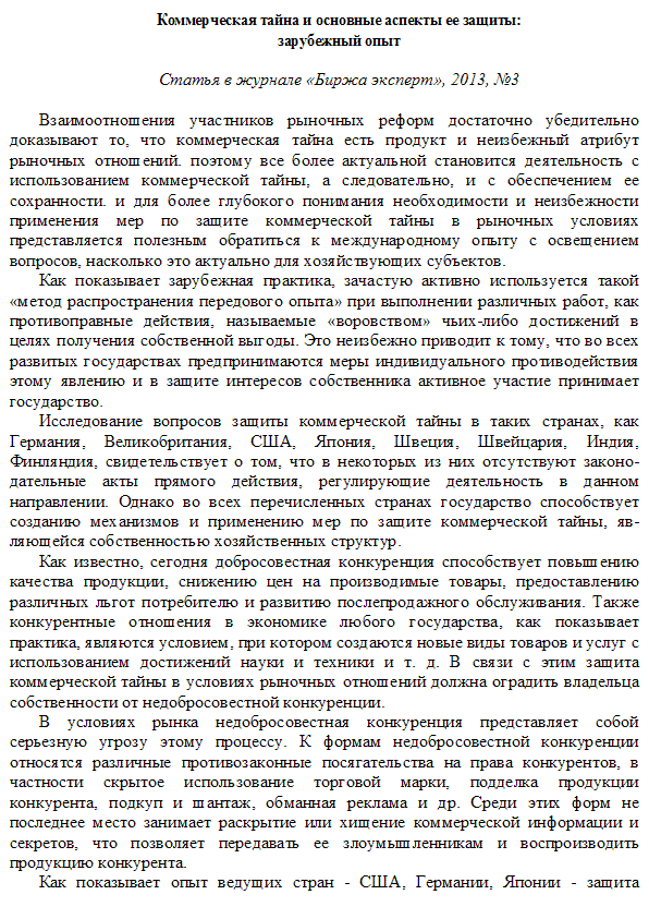 Коммерческая тайна и основные аспекты ее защиты: зарубежный опыт |