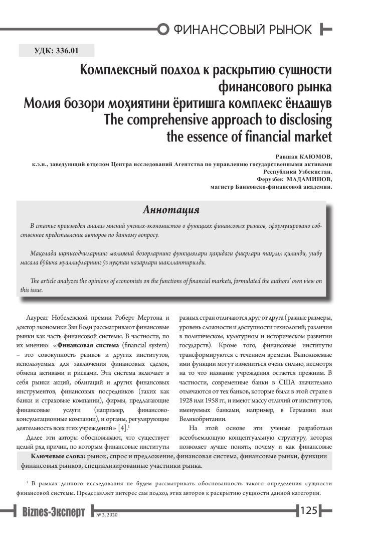 Р. Каюмов: «Комплексный подход к раскрытию сущности финансового рынка» |
