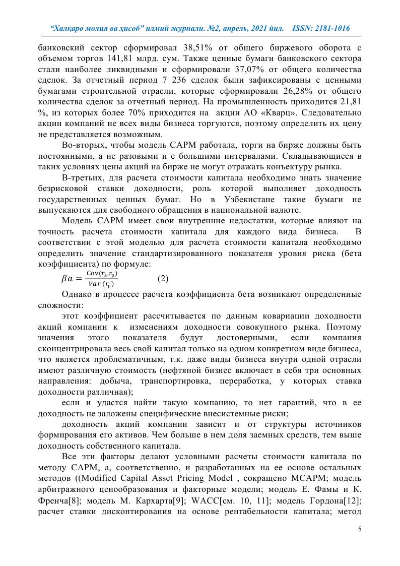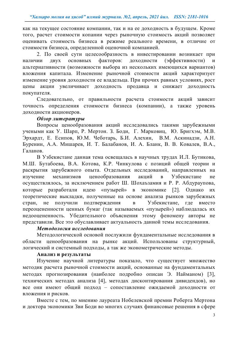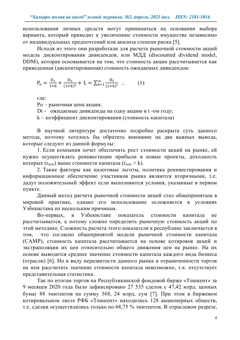 Каюмов Р.И., Исмоилова М.Д., Саидов Х.Б. «Совершенствование методов оценки рыночной стоимости акций в Узбекистане» |