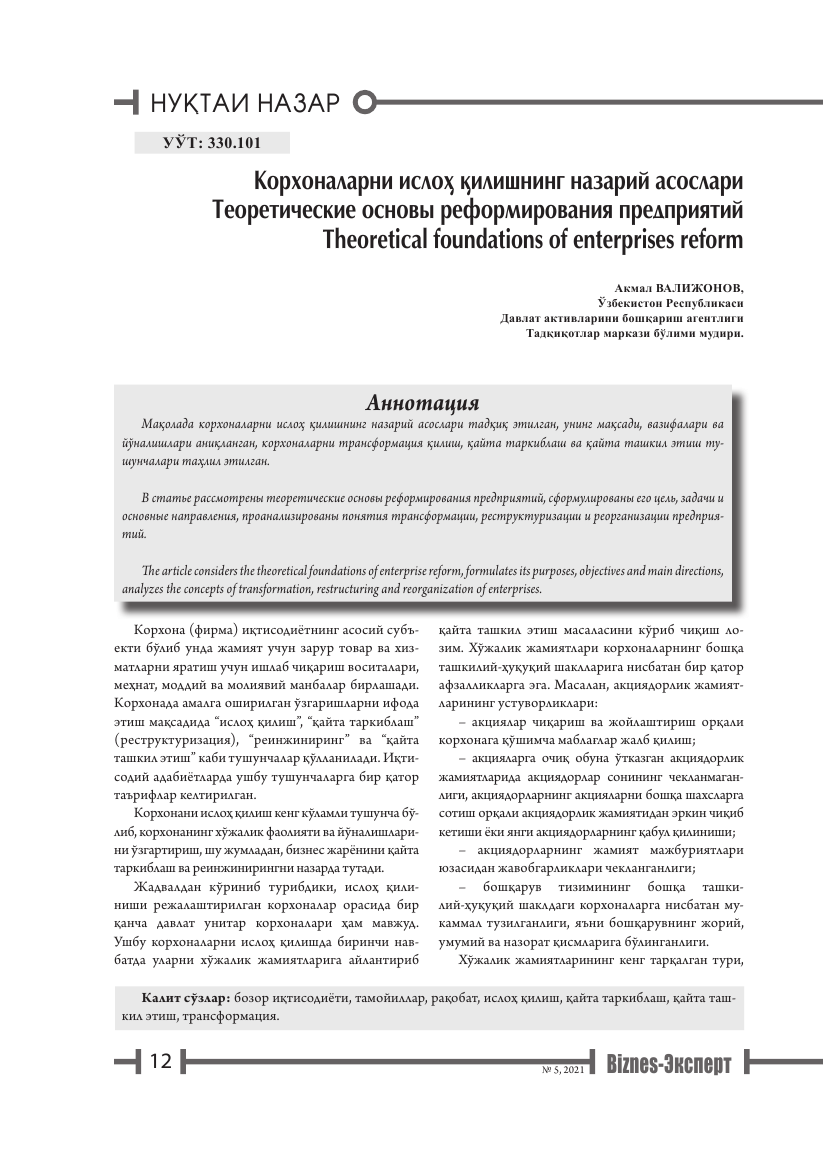 Валижанов А.: «Корхоналари ислоҳ қилишнинг назарий асослари» |